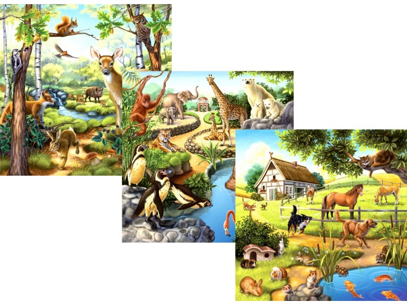 Milyen állatok élnek az erdőben, a szavannán és a gazdaságban? Az Állatok 3 x 49 darabos puzzle megtanítja neked! A puzzle három környezetben mutatja be Neked az állatokat. A mozaikdarabok könnyedén illeszkednek, a három kirakóssal a gyerekek versenyezni is tudnak, ki a gyorsabb. Az Állatok 3 x 49 darabos puzzle kirakott méretei: 18 x 18 cm.
