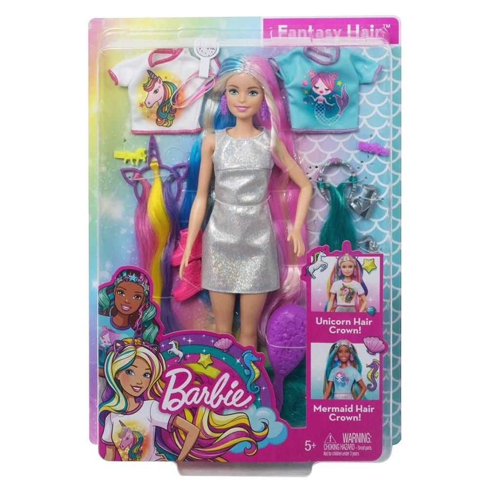 Ez a fantasztikus Barbie® baba színes és fényes hajjal érkezik… ami még fantasztikusabbá válhat! A készlet minden kelléket tartalmaz, amivel pillanatok alatt egy mágikus karakterré alakíthatod át – egy unikornissá vagy sellővé. Az átváltoztatás egyszerű – trikóba bújik, felveszi a hajpántot, és a stílusos kiegészítőket. Barbie fényes, színjátszó ruhában érkezik, ezüst magassarkúban és fülbevalóval. Ráadhatod az unikornis mintás pólót vagy a sellőset, a hozzájuk illő fejpánttal.