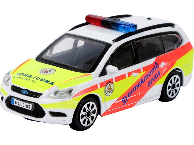 A Magyar Gyermekmentő Alapítvány által használt autók kicsinyített mása. A Bburago gyermek mentőorvosi kocsi egy Ford Focus autó, villogóval és az itthoni mentőorvosi autók festésével. A kisautó fémből és műanyagból készült, bármilyen 1:43 méretarányú pályán használható. Az autó motorháztetején az Ambulance felirat, a Magyar Gyermekmentő Alapítvány logója szerepel, az oldalán a gyermekmentő orvos felirat díszíti. Méretek: 10 x 4 x 4 cm.