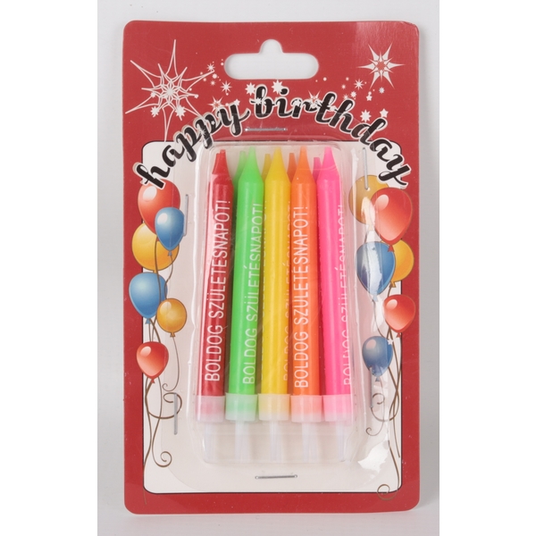 Minden torta kihagyhatatlan kelléke a gyertya. A csomag 10 db feliratozott, színes gyertyát tartalmaz. A gyertya hossza: 10 cm. A csomagolás mérete: 11 x 2 x 10 cm.