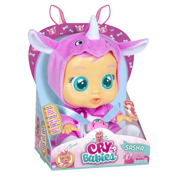 A Cry Babies interaktív kisbabák rendkívül érzékenyek, nagyon könnyen elsírják magukat! Sasha, az orrszarvús pizsibe bújt kislány odavan a cumijáért, és nagyon nyűgös lesz ha elveszik tőle. Hangos sírásba kezd, és csak akkor nyugszik meg, ha a gyerkőc visszaadja a cumiját, aztán alaposan megölelgeti! A baba kapucniját lehúzva megtölthető vízzel, így sírás közben könnyezni fog. A kislányok most felfedezhetik a Cry Babies Magic Tears animációs sorozatot, amely új Fantázia epizódokat tartalmaz a YouTube-on. A baba mérete: 17 x 12 x 29 cm.