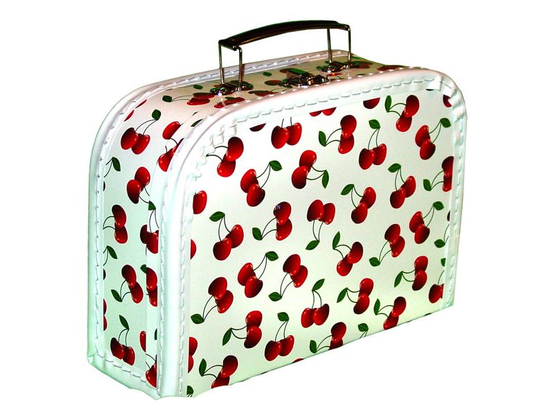 Kemény kartonból készült, varrott műbőr szegélyű bőrönd, fém foganytúval és csattal. A bőrönd fehér színű és cseresznyékkel van díszítve. Tárold benne kedvenc játékaidat, amiket a bőrönd segítségével bárhova magaddal tudsz vinni.