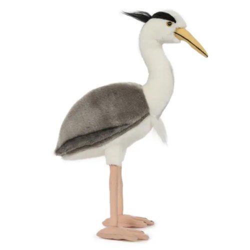 Prémium minőségű, Semo márkájú, 33 cm-es élethű álló szürke gém plüss madár, műanyag szemekkel.
