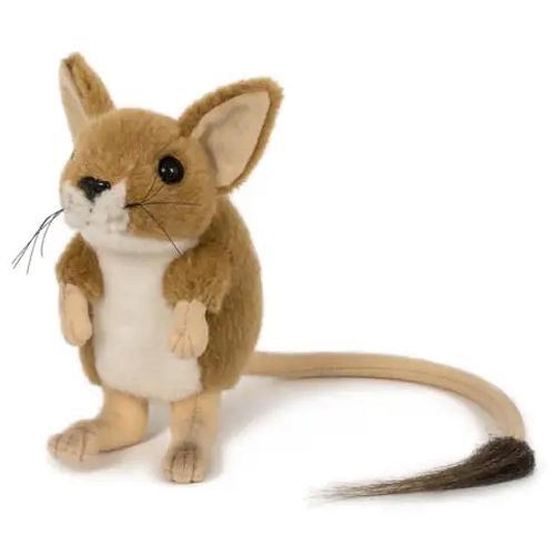 Prémium minőségű, Semo márkájú, 15 cm-es élethű barna színű plüss ugróegér, műanyag szemekkel, hosszú farokkal.