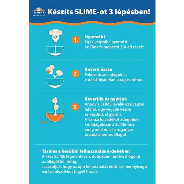 Legyél kreatív az Elmer’s transzparens ragasztóval! Kíválóan alkalmas slime ragacs készítéshez! A Legegyszerűbb slime készítés! Mindösszesen keverd össze az Elmer’s varázs folyédékkal a megfelelő arányban, és máris kész a slime! Továbbiakban ideális kézműves, dekorációs és iskolai feladatokhoz. Különböző felületeket díszítésére alkalmas, amellyel kreatív csillogó ajándékokat készíthetsz.