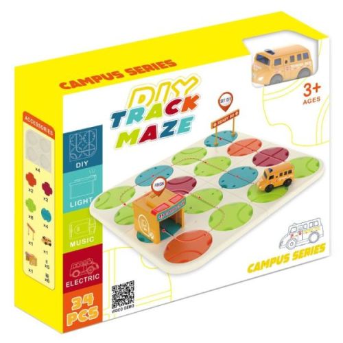 Tartalom: 4 db alaptábla, 16 db útelem (több színű és funkciójú), 1 db induló kapu, 1 db iskolabusz, 1 db cél (garázs), összekötő elemek az alaptáblák összeépítéséhez (5 db kicsi, 6 db nagy). Elemszükséglet: Garázs: 3 x AG13 (tartozék), Iskolabusz: 1 X AAA (nem tartozék).