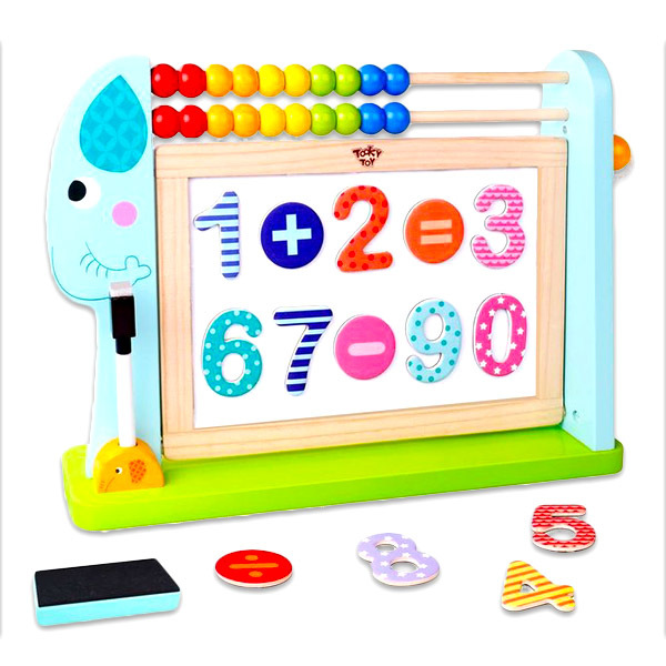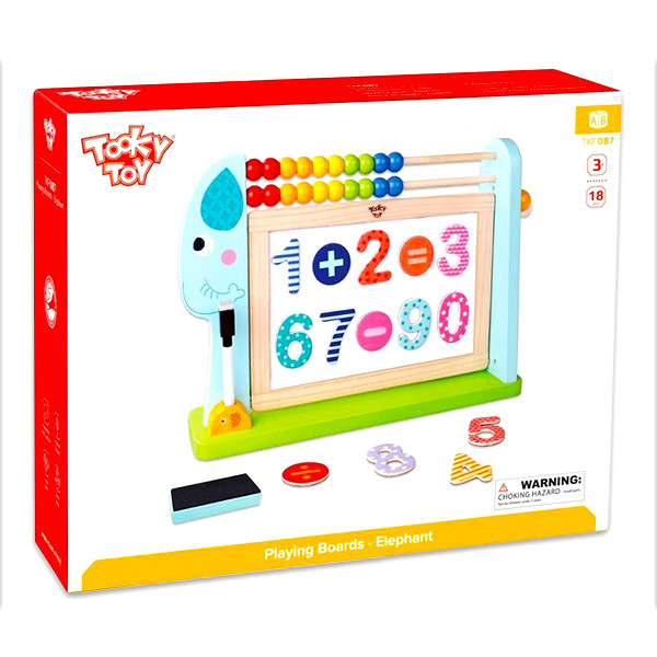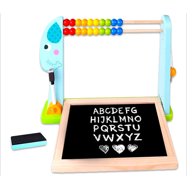 Az elefántos, multifunkciós tábla mókásan tanítja gyermeked. A kétoldalú tábla egyik felére krétával lehet írni vagy rajzolni, a másik felére pedig mágneseket tudsz rakni. A csomagolás szám alakú mágneseket is tartalmaz. A tábla tetején két sor színes gyöngy is található. Méretek: 38 x 8 x 27 cm.