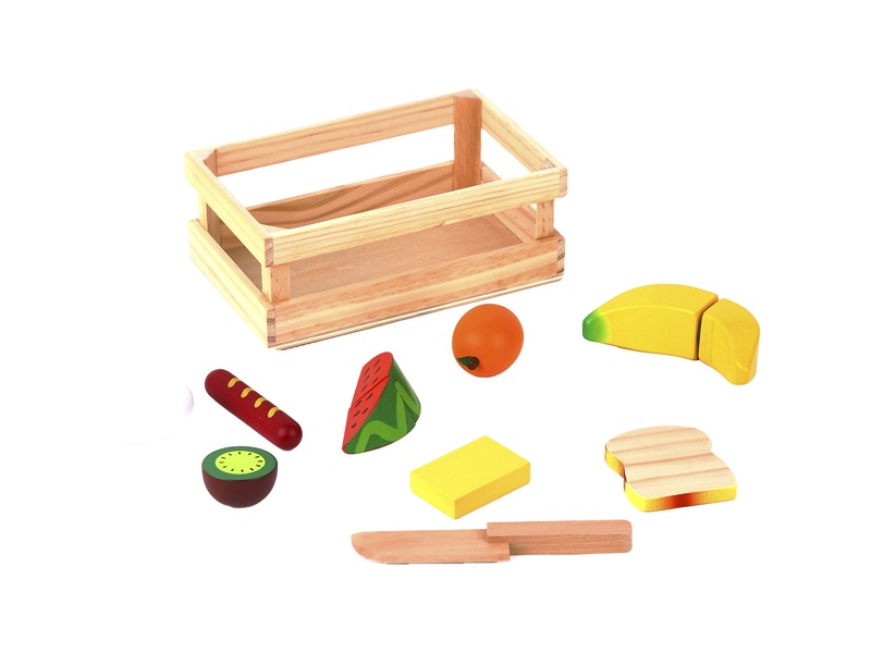 Készíts ebédet a friss ennivalókból! A Fa élelmiszer készlet tojást, virslit, kenyeret, vajat, kivit, dinnyét, narancsot és banánt tartalmaz, egy zöldséges ládába csomagolva. A banánt akár ketté is vághatod a készlethez tartozó fa késsel. A banán darabjai tépőzárral csatlakoznak egymáshoz, amit a késsel pillanatok alatt el tudsz vágni. A Fa élelmiszer készlet csomagolási méretei: 18 x 8 x 11 cm.