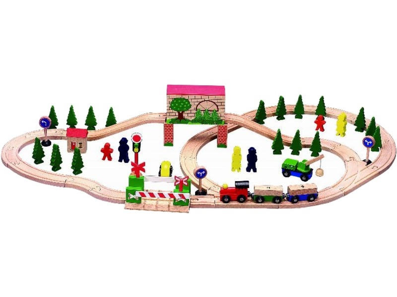 Építs meg egy hatalmas erdei vasútpályát! A Fa vonat 60 darabos készlet fából készült síneket, mágnessel kapcsolódó mozdonyt és vonatkocsikat, munkagépet, fákat és kiegészítőket is magában foglal, amikből álmaid vasútját is össze tudod rakni. A pályát híddal, alagúttal és váltókkal, valamint egy autós átkelővel is izgalmasabbá teheted, a készlet emberfigurákat is tartalmaz. A Fa vonat 60 darabos készlet csomagolási méretei: 40 x 7 x 32 cm.
