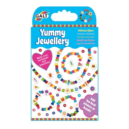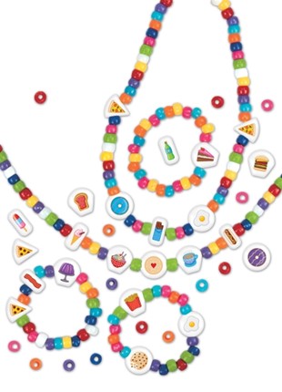Készíts karkötőket és nyakláncokat ezekből a nagyszerű, fincsi gyöngyökből. Használd fel a dobozban található ételeket ábrázoló gyöngyöket és matricákat.