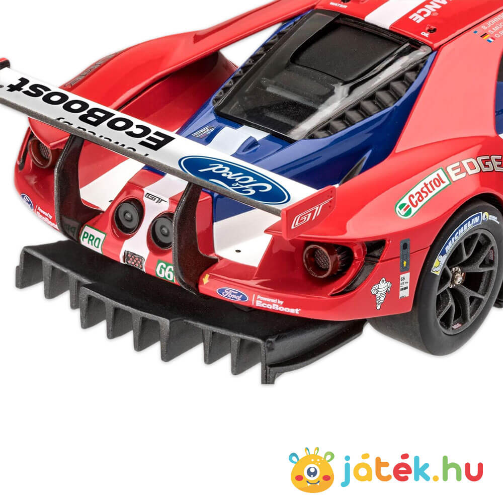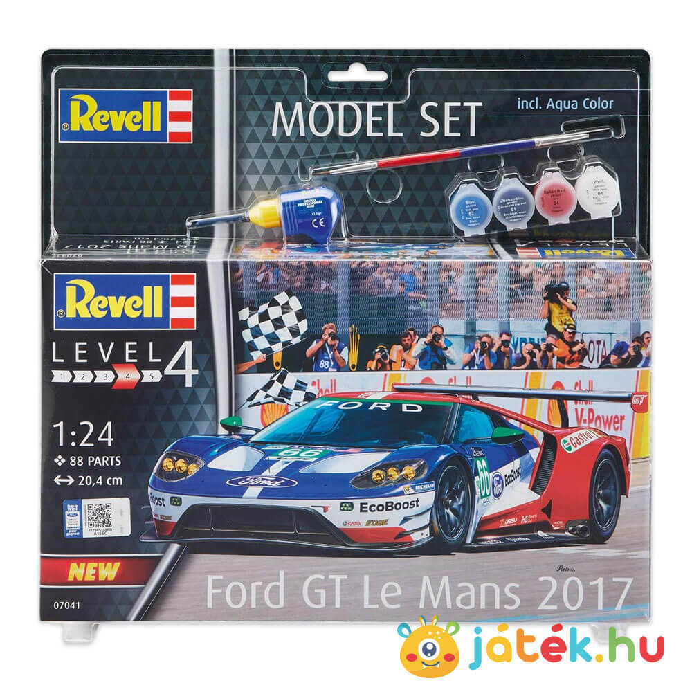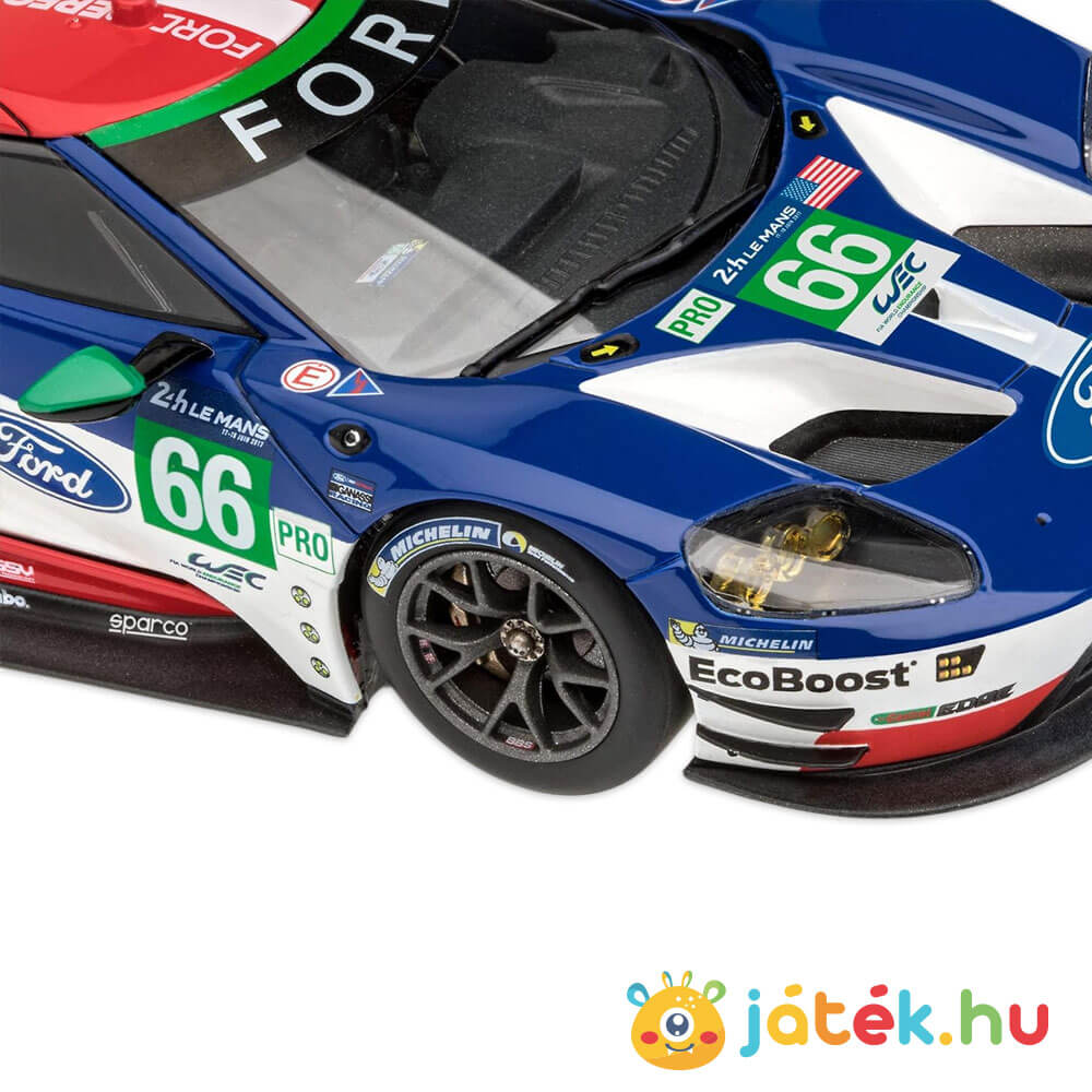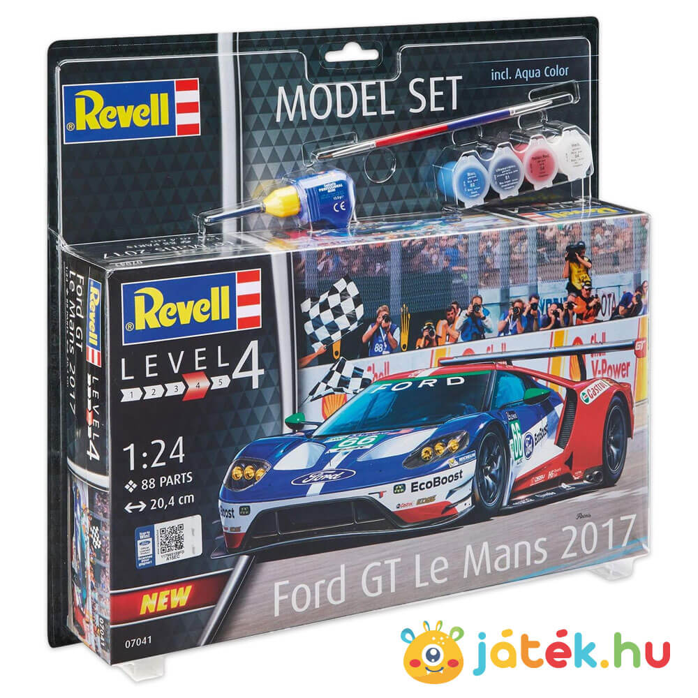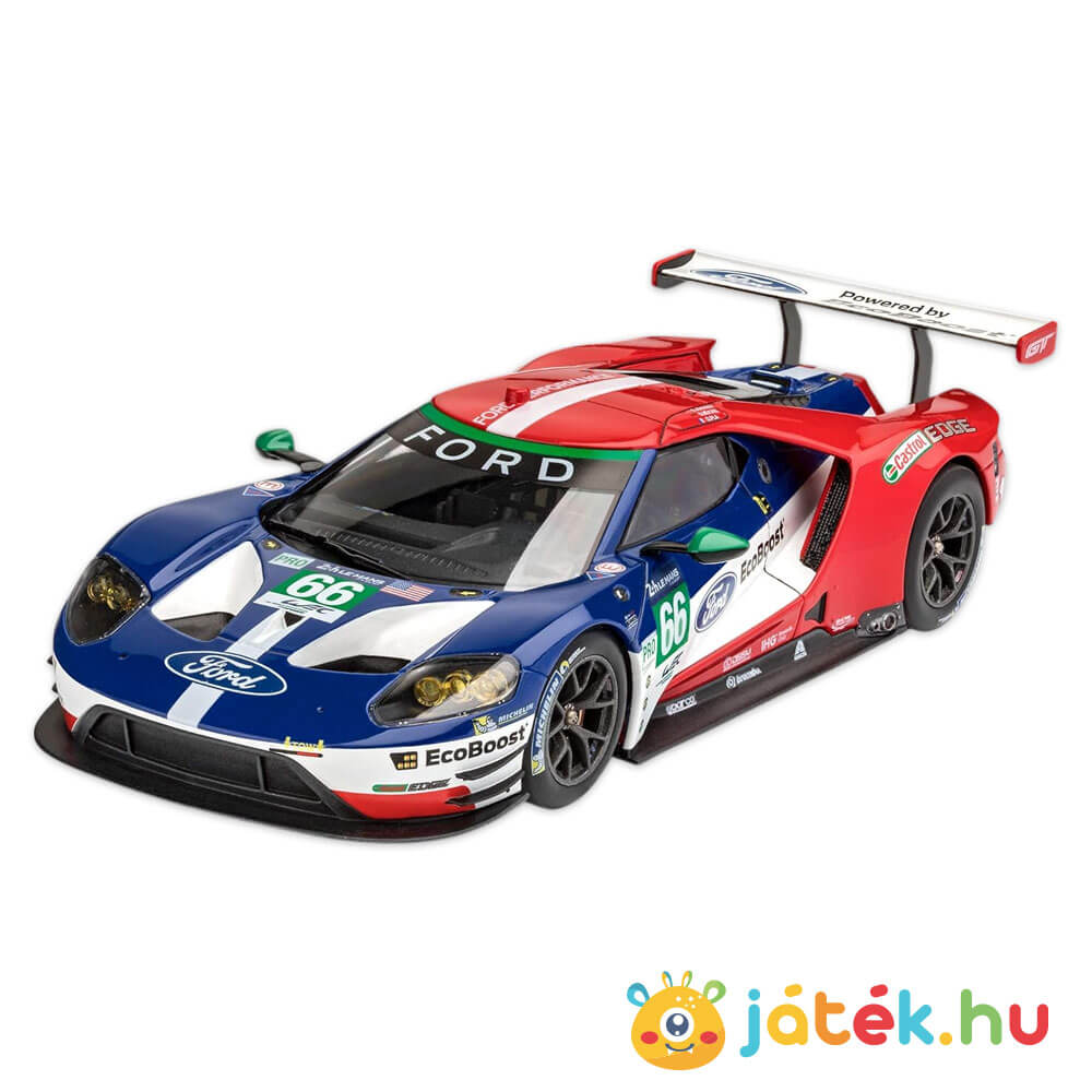 A Revell Ford GT Le Mans 2017-es versenyautó makettje 1:24 méretarányban kínál valódi építési élményt mindazoknak, akik szeretik az autóversenyek világát és az aprólékos modellezést. A dobozban minden megtalálható, ami az építéshez szükséges, így a ragasztó, az ecset és a festékek is helyet kaptak, így már az első pillanattól kezdve nekiláthatunk a munkának. A karosszéria két részből épül fel, a belső tér és a motor kidolgozása részletgazdag, a matricák pedig az eredeti versenyautó színeit és rajtszámait idézik meg. Amikor a modell elkészül, körülbelül húsz centiméter hosszú lesz, látványos dísze lehet bármelyik polcnak vagy vitrinnek.