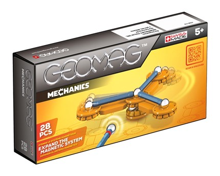 A Geomag MECHANICS 28 db-os mágneses építőjáték szett összesen 28 db műanyag és fém építőelemet, illetve acélgolyót tartalmaz.