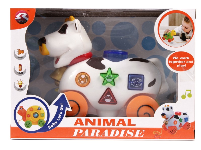Húzd magad után a foltos zenélő bocit! A Húzható zenélő tehén bébijáték egy műanyagból készült, fekete-fehér bocifigura, gombokkal az oldalán. A gombokat megnyomva más-más állatok hangját imitálja a játék, a hátán lévő gombot megnyomva a tehén világítani kezd, és vidám dallamot játszik. A boci egy madzaghoz van kötve, amivel a pici húzni tudja maga után, a Húzható zenélő tehén bébijáték fejleszti a mozgékonyságot, a megfigyelést és a szem-kéz koordinációt is. A játék 2 db AA ceruzaelemmel működik, a csomagolás az elemeket nem tartalmazza. Boci méretei: 15 x 7 x 11 cm.
