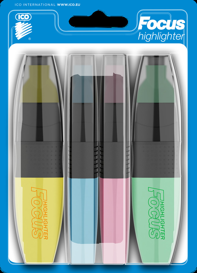 Speciális pasztell színű festékkel töltött szövegkiemelő, egyedi testforma kialakítással, csúszásgátló fogófelülettel. A kiemelt szöveg fénymásolható, faxolható. Vágott csúccsal. Vonalvastagság: 1-4 mm. A csomag 3 db színt tartalmaz.