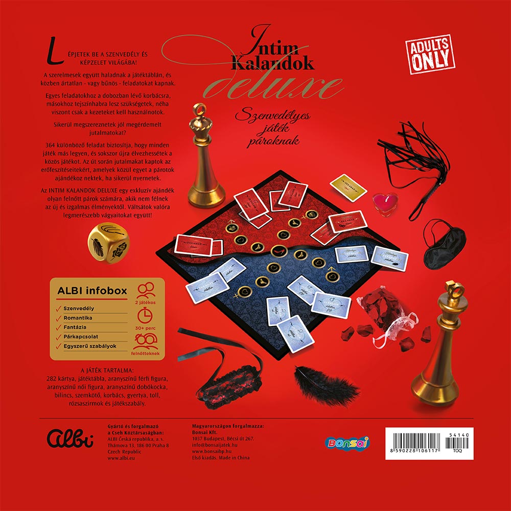 Az Intim Kalandok Deluxe egy szenvedélyes társasjáték kifejezetten pároknak, akik szeretnék feldobni a közös estéket, új élményeket keresnek, és nem riadnak vissza a játékos kihívásoktól. A játék során a szerelmesek együtt haladnak végig a játéktáblán, miközben különféle ártatlanabb vagy éppen merészebb feladatokkal találkoznak, amelyek közelebb hozzák egymáshoz a résztvevőket.