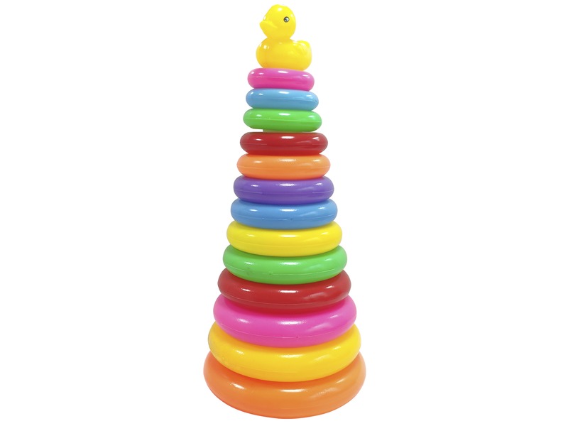 Fejleszd kézügyességed a nagy Montessori kacsás toronnyal! A bébi a szivárvány színeiben pompázó karikákat egymásra tudja tenni, játék közben megismeri a színeket, fejlődik a szemmértéke és a problémamegoldó képessége is. A torony tetejére végül egy sárga kiskacsát tud felültetni. A torony műanyagból készült, 43 cm magas.