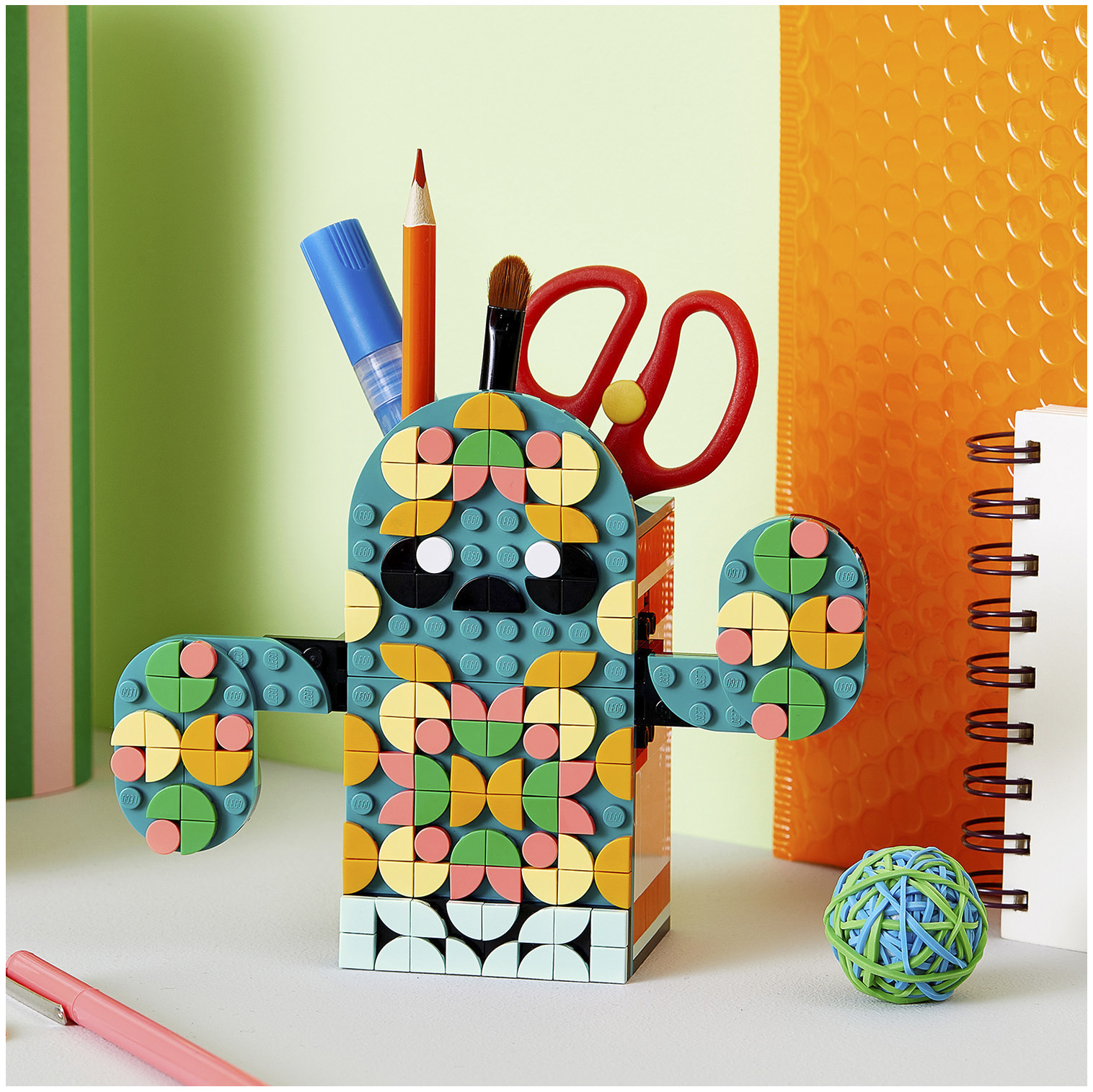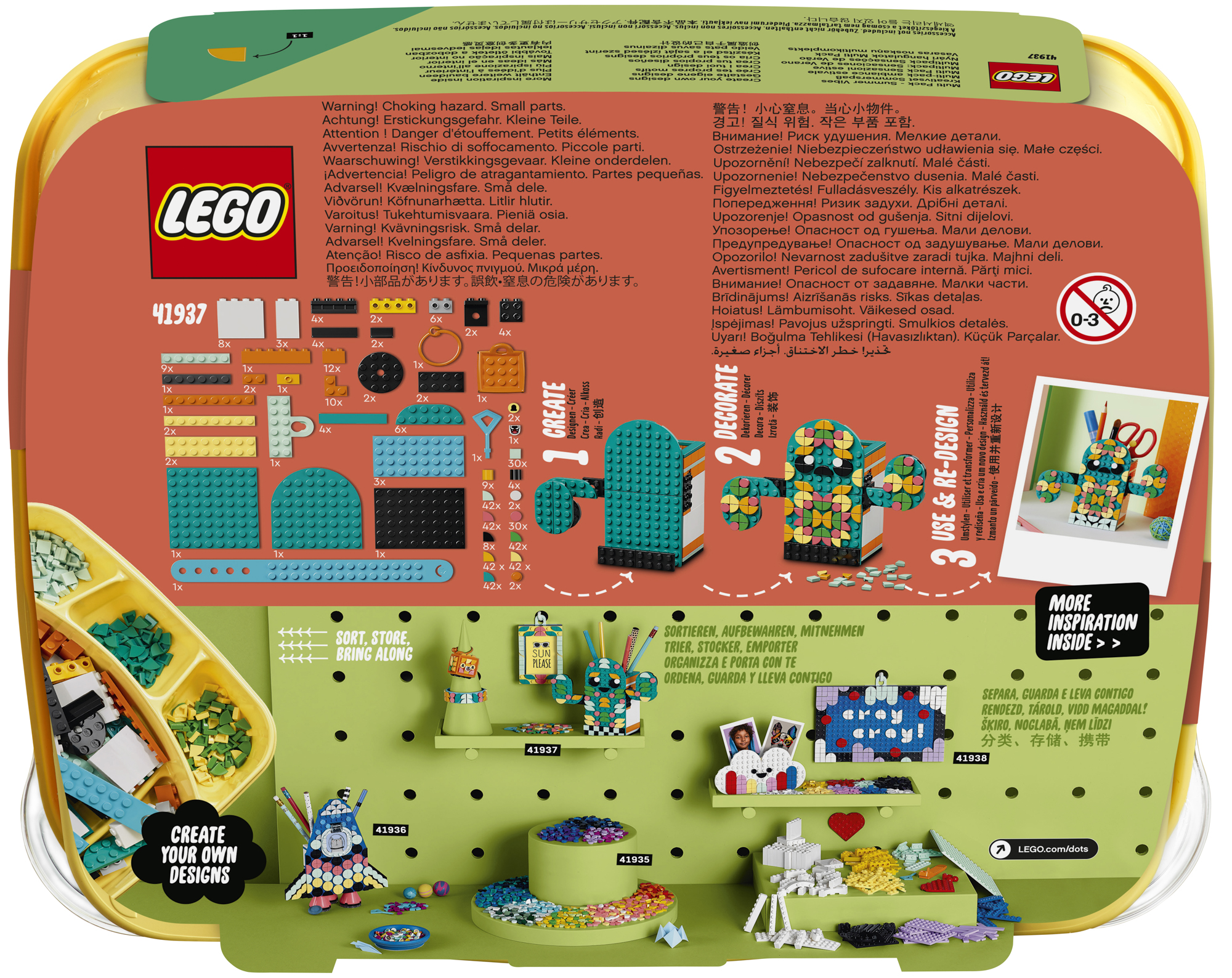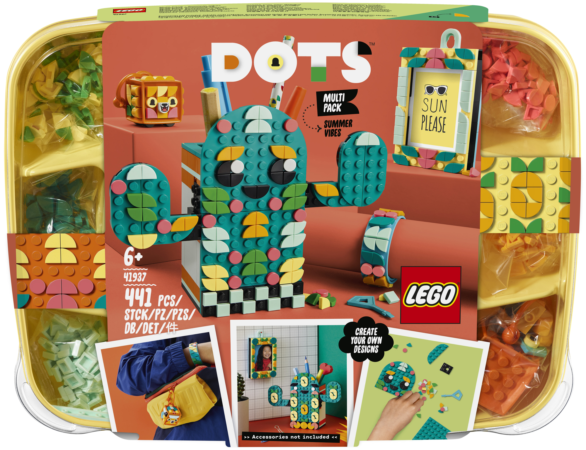 A LEGO® DOTS Nyári hangulatok Multi Pack 41937 készlet remek választás. A doboz kreatívan bevezeti a gyermekeket a DOTS világába, ahol rengeteg különféle, akár egyszerű, akár részletesebb elem segítségével fejleszthetik tervezési készségeiket és önbizalmukat.Változatos DIY szórakozás Ez a kézműves készlet különféle, személyre szabható DOTS hordható elemeket vagy szobadekorációs tárgyakat tartalmaz, köztük egy karkötőt, egy oroszlános táskadíszt, egy képkeretet akasztóelemmel és egy kaktuszformájú tolltartót is. A gyermekek a mellékelt csempékkel végtelen mintákat alkothatnak! Nyári kézműves hangulatok A multi pack készlet nyújtotta extra vidámsággal a gyermekek cserélgethetik a mintákat a különféle elemeken, így bemutathatják kreatív alkotásaikat, vagy megoszthatják azokat a barátaikkal. A készlet nagyszerűen bevezeti a gyermekeket a DIY kreativitás vagy a csoportos kézműves tevékenységek világába, ahol mindenki alkothat valamit.