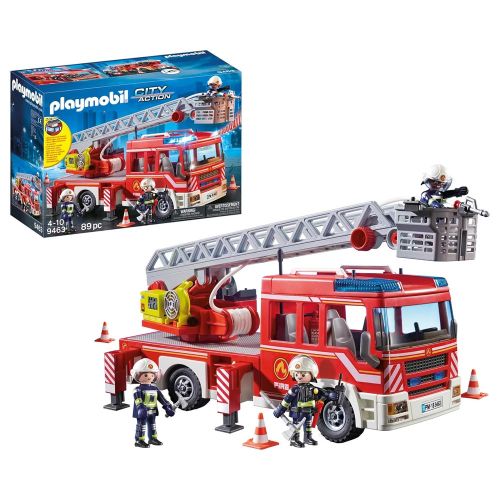 Menj tüzet oltani a szirénázó, létrás tűzoltóautóval! A Playmobil létrás tűzoltóautó 9463 egy forgatható létrával felszerelt kamion, amivel a tűzoltók sietnek az égő házakhoz. A kosár egy fecskendővel is el van látva, így a magasabb emeleteken is el tudod oltani a tomboló lángokat. Az autó gombnyomásra fényeket és hangokat is ad ki magából, a készlet 3 darab Playmobil tűzoltó figurát is magában foglal. A játék 2 darab AAA 1,5-V mikro ceruzaelemmel működik, a csomagolás az elemeket nem tartalmazza.