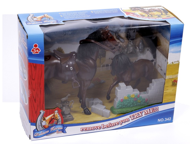 Barna paci és csikója, díjugrató készletben! A Ló és csikó készlet egy műanyagból készült felszerszámozott felnőtt lovat, egy csikót és a lovagláshoz szükséges eszközöket tartalmazza. A lovakkal gyakorolni tudod a díjugratást, az eszközökkel ki tudod fésülni a sörényüket, a táppal meg is lehet etetni a paripákat, hogy szépek és egészségesek legyenek! A Ló és csikó készlet együtt használhatók más akciófigura készletekkel is. Ló mérete: 19 cm, csikó mérete: 12 cm.