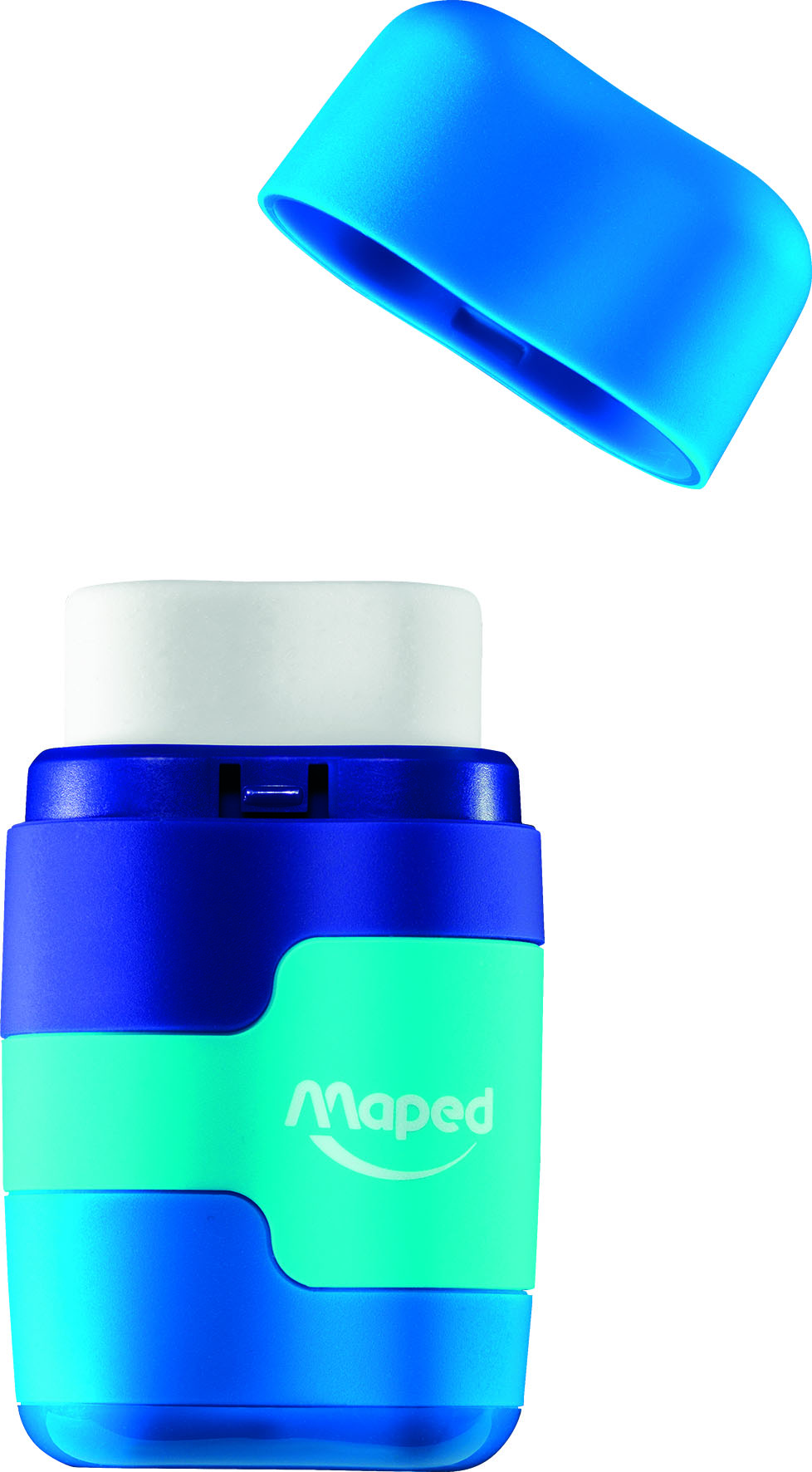 MAPED kétlyukú hegyező radír véggel. Ergonomikus kialakítású, használata kényelmes. Mindkét oldalara biztonsági fedéllel van ellátva. Radír PVC mentes. A termék kétféle színváltozatban érhető el. Az ár 1 db-ra vonatkozik, amelyet véletlenszerű változatban szállítunk.