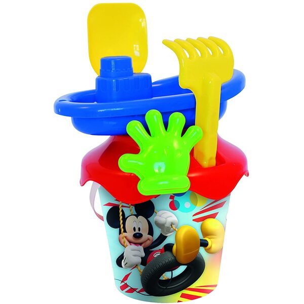 Mikiegér mintás homokozószett. Tartalom: 1 db homokozóvödör, 1 db hajó, 1 db homokozó forma, 1 db lapát, 1 db gereblye