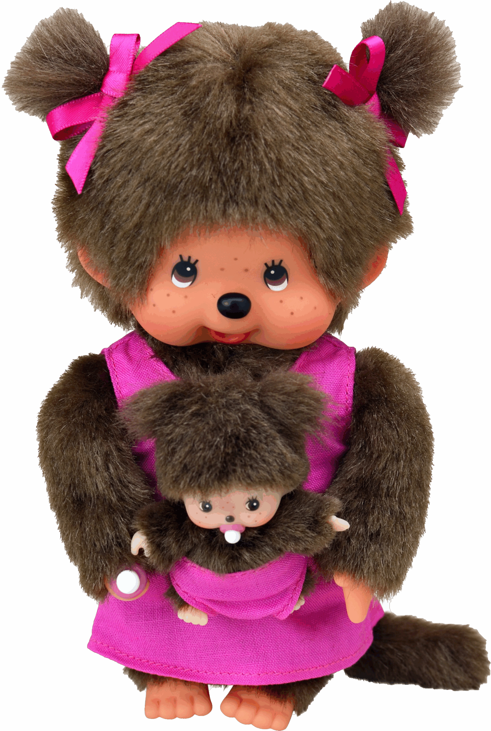 Gyerekek és felnőttek egyaránt elmosolyodnak, amikor meghallják a Monchhichi nevet. A kedves majmocska már évtizedek óta megtalálható, és sok gyermek – most már felnőtt kedvence. Monchhichi anyuka rózsaszínű ruhában kicsinyével, 20cm-es méretben. Moncsicsi.