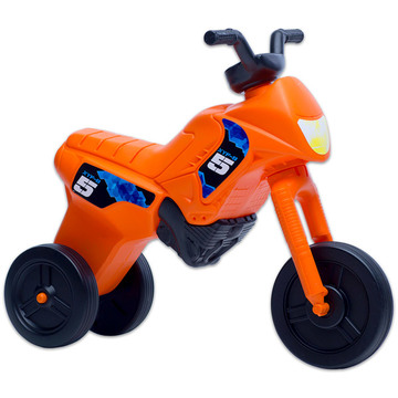 Vagány, egyszerű felépítésű, műanyagból készült narancssárga lábbal hajtós kismotor. Az első kerék kormányozható, és műanyagból készült, a motor matricákkal van díszítve. Méretek: 58 x 17 x 46 cm. Ülésmagassága: 30 cm.
