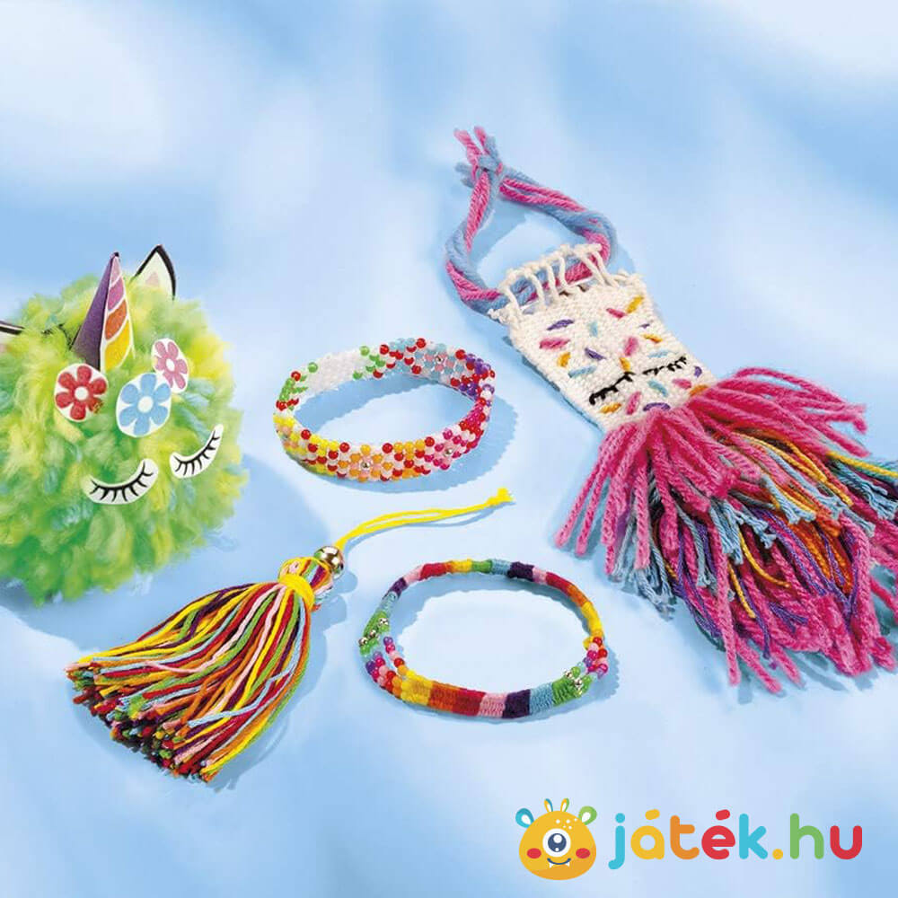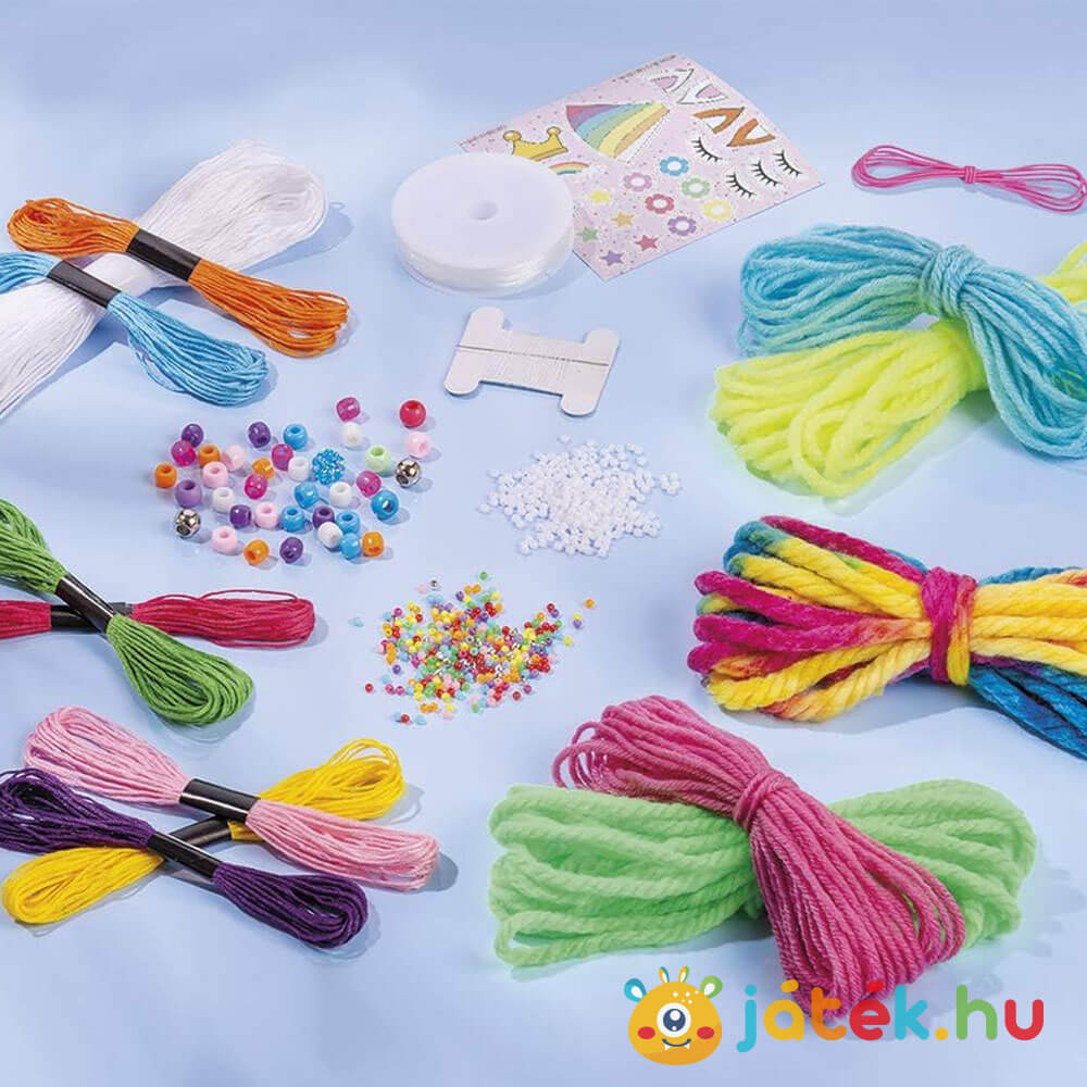 Engedd szabadjára a fantáziádat és alkoss különféle kézműves tárgyakat a stúdió segítségével. A készlet tartalmaz 3 db összeépíthető kreatív szerkezetet, különböző színű és vastagságú fonalakat, színes gyöngyöket, cérnát, tűket, és egy unikornis mintájú matrica készletet.