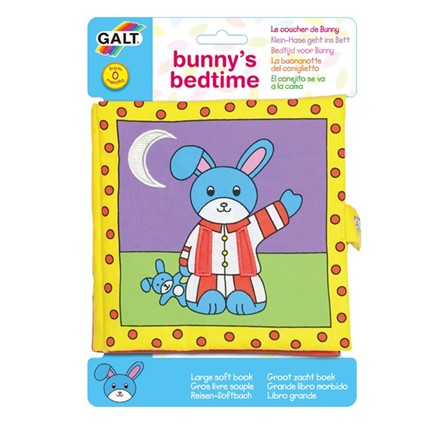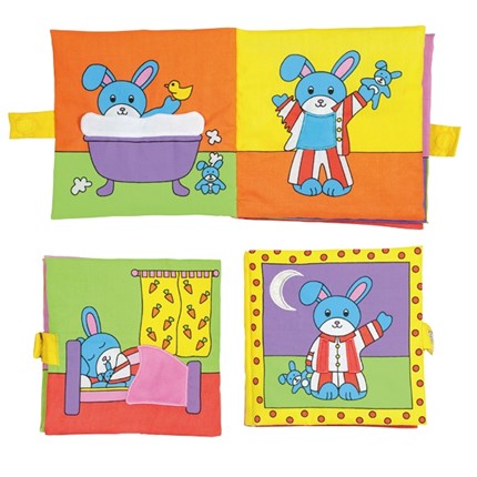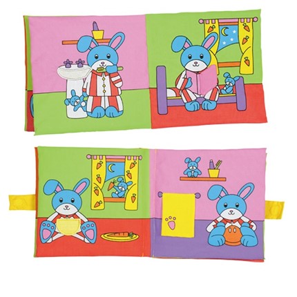 Puha, nagy textilkönyv a legkisebbek számára. Könyvecske színes oldalakkal és aranyos illusztrációkkal. A könyv, a nyuszi alvás előtti teendőit mutatja be.