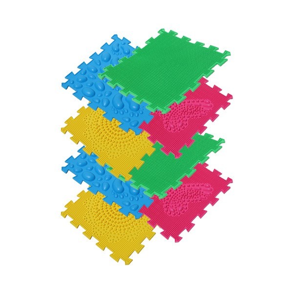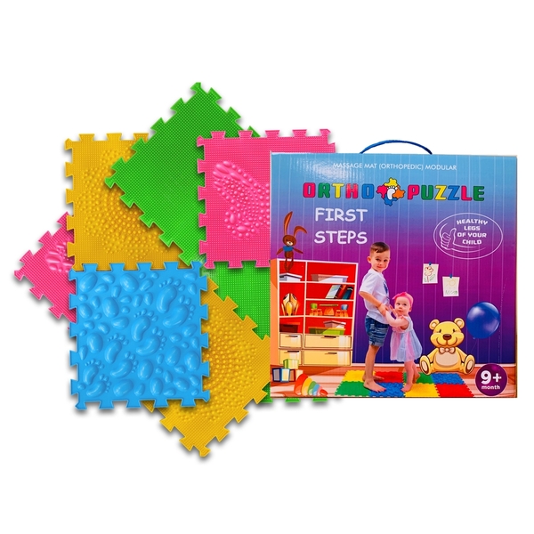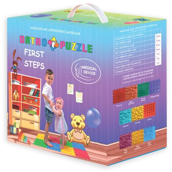 Az Ortho Puzzle – ortopédiai masszázs szőnyeg több, összeilleszthető puzzle elemből álló készlet. Elsősorban a talp reflex zónáinak akupresszúrájára, lúdtalp megelőzésére, kezelésére, a láb-és talp izomzat, inak megerősítésére javasolt. A puha és kemény felületek váltakozása stimulálja a talpboltozatot és hozzájárul az egészséges, helyes lábtartás kialakulásához és megszilárdításához. A különböző mintájú felületek masszírozzák a talpat, serkentik a vérkeringést és erősítik az immunrendszert. Pozitívan hat a kicsik korai fejlődésére is, elősegíti a tapintást, látás érzékelést, szín felismerést és a kreativitást. Az Ortho Puzzle gyógyászati segédeszköz, a gyerekek fizikai és pszichológiai fejlődéséhez is hozzájárul, a szőnyegek felülete a természetes talajegyenlőtlenségeket mintázza, ezzel stimulálva az érzékszerveket. Az első lépések készlet 8 db különböző témájú masszázs puzzle elemet tartalmaz. Elősegíti a lábfej helyes fejlődését, megakadályozza helytelen, asszimetrikus járás kialakulását, csökkenti a lúdtalp kockázatának kialakulását. A puzzle elemek szappanos vízzel moshatóak, hipoallergénén anyagból készültek. Anyaga: 100% PVC. 9 hónapos kortól ajánlott. A 8 darabos szettből kirakható terület mérete: 0,5 m2. Alkotóelemek: – 2 db „kavicsok“ modul – 2 db „puha fű” modul – 2 db „napraforgó“ modul – 2 db „pillangó“ modul