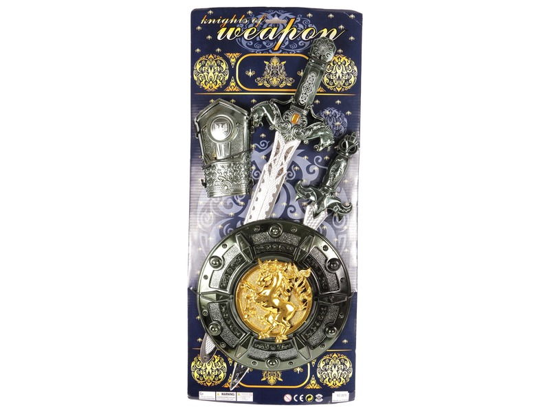 Védekezz és támadj lovagi fegyverekkel! A Lovagi pajzs készlet kardokkal sötét színű, arany unikornissal díszített kerek pajzsot, kettő kardot és egy csuklóvédőt tartalmaz, amiket bármilyen lovagi jelmezhez felvehetsz. A kardok ezüstös színű pengével készültek, a hegyük és élük is tompa, ezért nem tudtok egymásnak sérülést okozni velük. Győzd le az ellenséget, és támadás esetén bújj a pajzsod mögé! Pajzs átmérője: 22 cm.