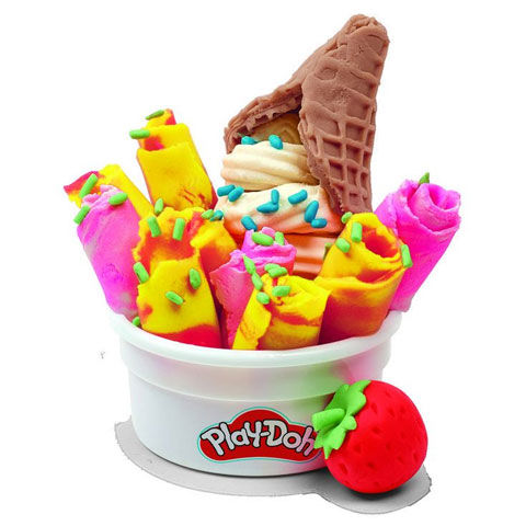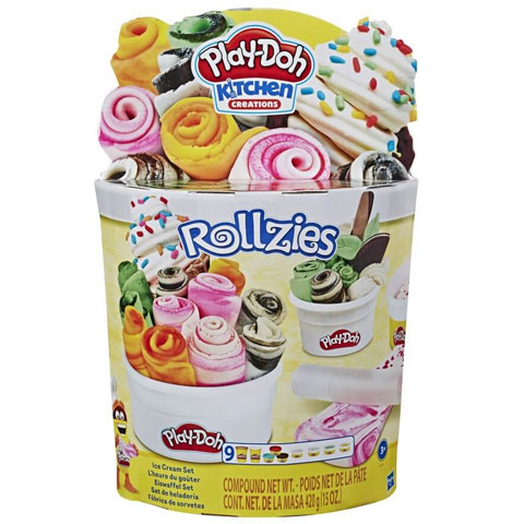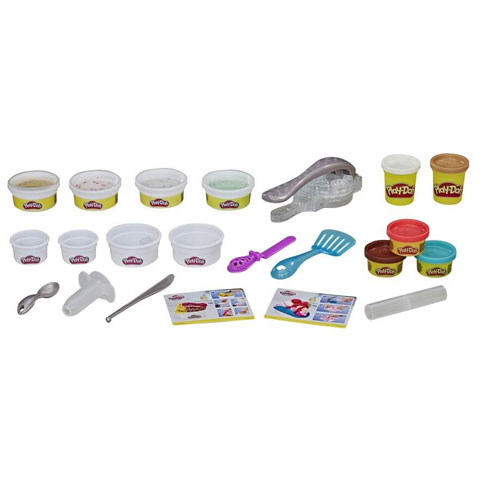 Készítsen egy nagyszerű ajándékot gyermekének! Adjon hozzá élénk színeket a játékhoz, vonzó finomságokat hozva létre! Egy henger segítségével formázza meg az anyagot a modellezéshez, és használjon spatulat és gofrisütőt színes jégkrém előállításához.