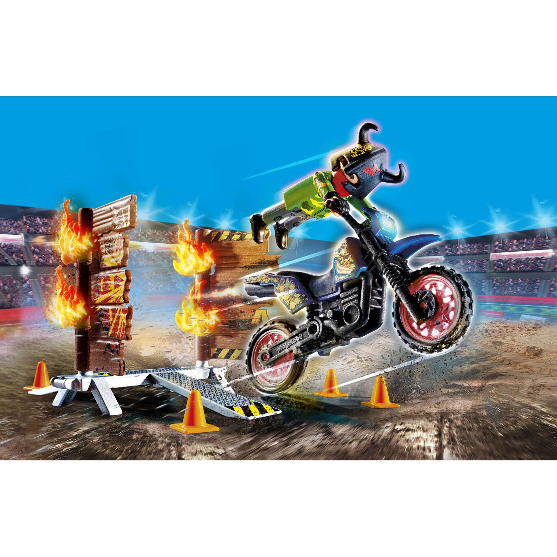 Figyelem, a következő trükköt senki ne próbálja ki otthon! A tapasztalt, ügyes motoros bemutatja legveszélyesebb kaszkadőrmutatványát, átugrat a tüzes falon! Mindenki izgatottan, ámulva lesi a veszélyes trükk minden pillanatát, ami nem is csoda, hiszen óriási bátorságra utal, ha valaki képes erre! Tartalom: 1 db figura, 1 db motor, tüzes fal, bóják