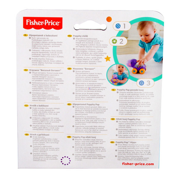 Műanyagból készült, kisebb kezekre tervezett mosolygó Poppity víziló figura. Ha elkezded tolni bármilyen sík felületen, a víziló pocakjában található színes golyók ugrándozni és csörögni kezdenek. A játék fejleszti a kézügyességet, és élénk színeivel azonnal magára vonja a pici figyelmét! Méretek: 14 x 8 x 9 cm. Fisher-Price minőség!