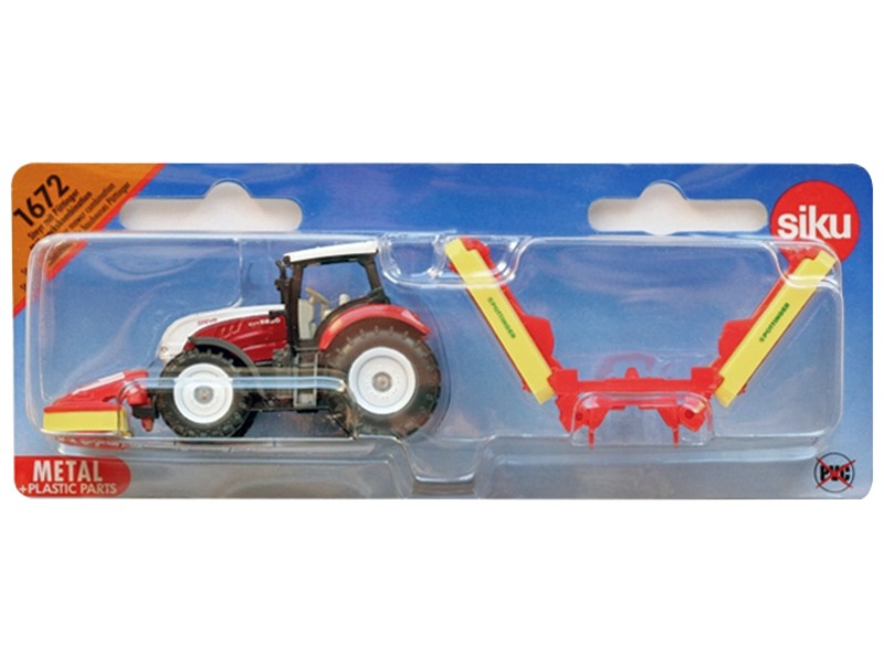 Piros Steyr traktor, permetező utánfutóval! A Siku: Steyr CVT 6230 traktor aratóval 1:87 méretarányú, fémből és műanyagból készült munkagép, ami után egy öntöző utánfutót tudsz kötni. A traktor elejére szintén egy öntöző van felszerelve, a vezetőfülke levehető, a munkagép együtt használható SIKU autókkal, játékkészletekkel is. A Siku: Steyr traktor aratóval 1:87 – 1672 mérete: 12 cm.