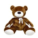 Sötétbarna színű, óriás, XXL méretű fehér masnis plüss maci, mely leültetve körülbelül 100 cm, teljes mérete kb. 150 cm.