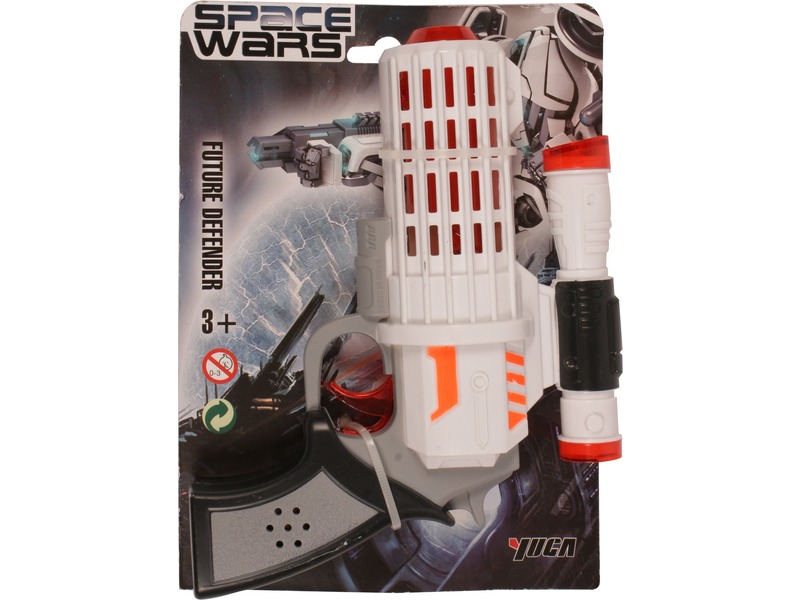Válj a jövő harcosává a Space Wars lézerpisztollyal! A Space Wars lézerpisztoly fénnyel és hanggal egy műanyagból készült, futurisztikus megjelenésű fegyver. Ha meghúzod a pisztoly ravaszát, a csöve villog, miközben lézerfegyver hangokat ad ki magából. A Space Wars lézerpisztoly fénnyel és hanggal 2 db AA ceruzaelemmel működik, a csomagolás az elemeket tartalmazza. Méretek: 19 x 5 x 15 cm.