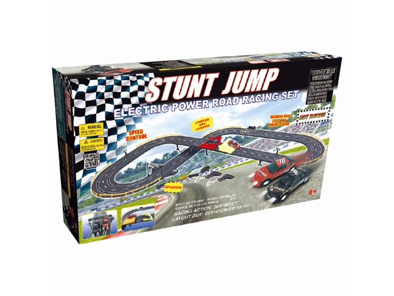 Ugrassátok át a versenyautókat a felüljáró tetején! A Stunt Jump autópálya egy elektromos meghajtású versenypálya, 2 darab sportautóval. A pályát több alkatrészből tudod 8-as formában összerakni, a versenyt két ugratóval tudod még izgalmasabbá tenni, amikkel az autók a levegőbe is emelkednek száguldás közben. Az autók sebességét egy egy karral lehet szabályozni, a játék 6 V-os adapterrel működik, a csomagolás az adaptert is tartalmazza. A Stunt Jump autópálya összerakott méretei: 85 x 147 cm, pálya hossza: 369 cm.