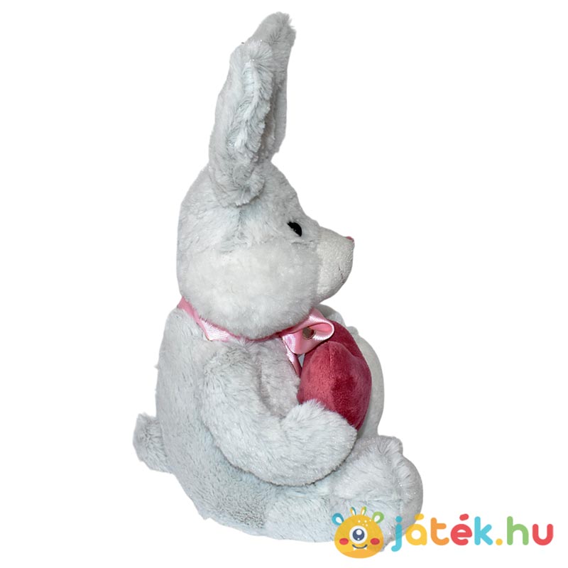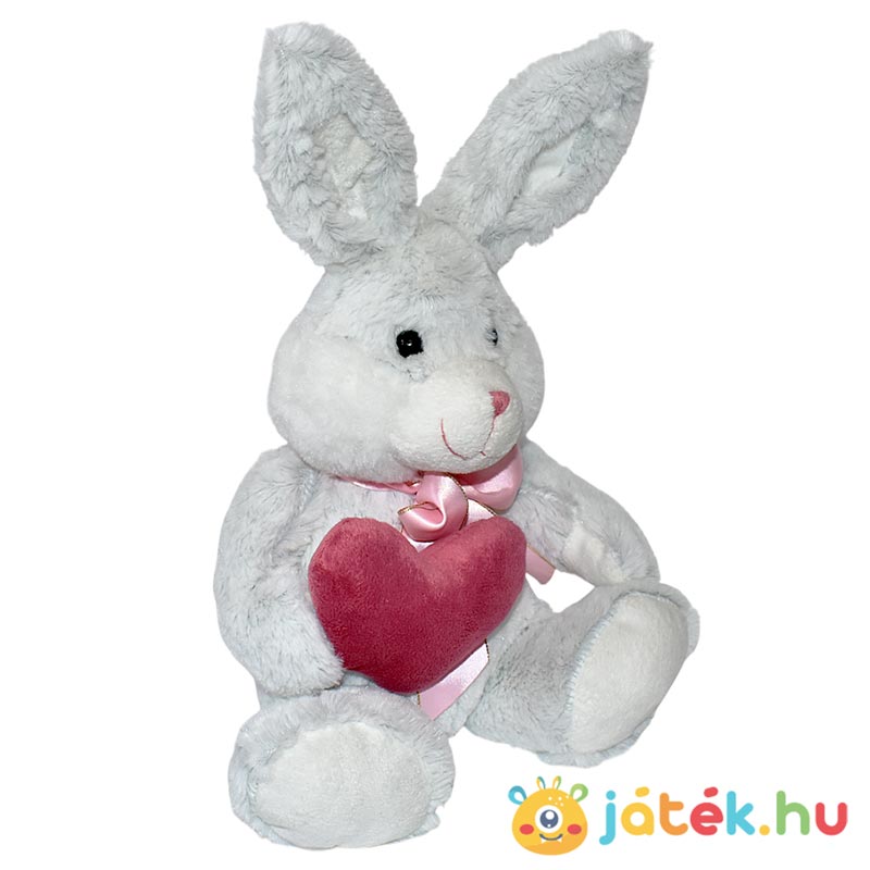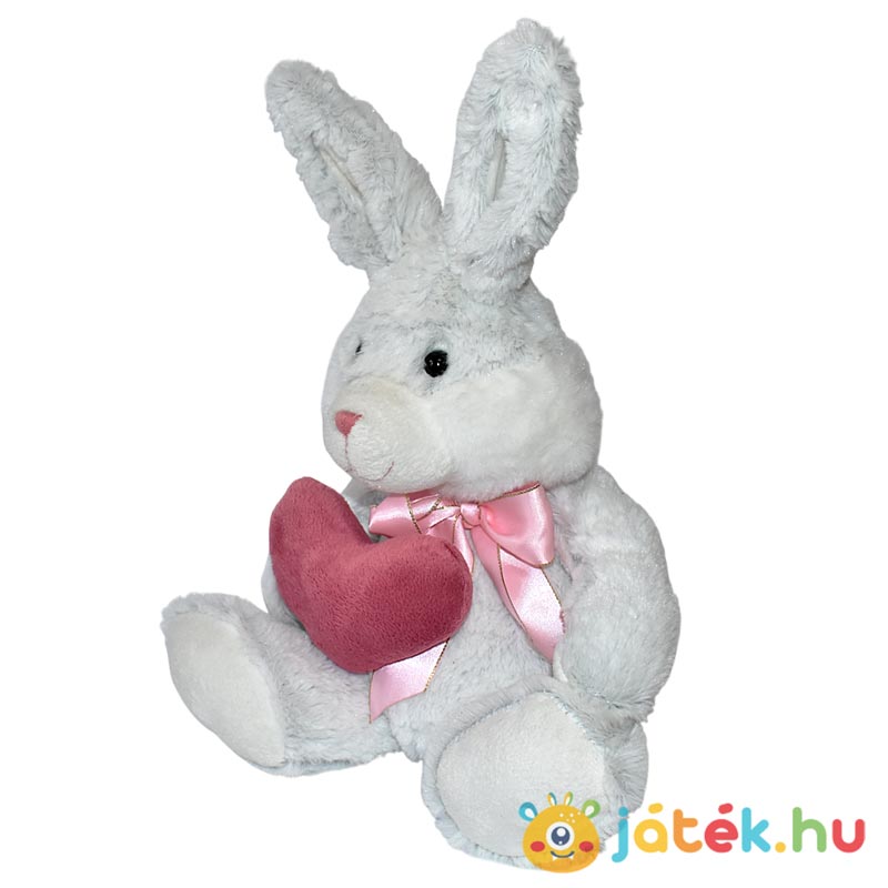 Szerelmes szürkésfehér ülő plüss nyuszi rózsaszín masnival és mályva színű szívecskével. Leültetve a feje tetejéig mérve 25 cm magas, a füle hegyéig mérve kb. 35 cm magas. Szeme műanyagból készült, orra hímezve van. Szerelmes nyuszi rajongónak évfordulóra, Valentin-napra szuper választás.