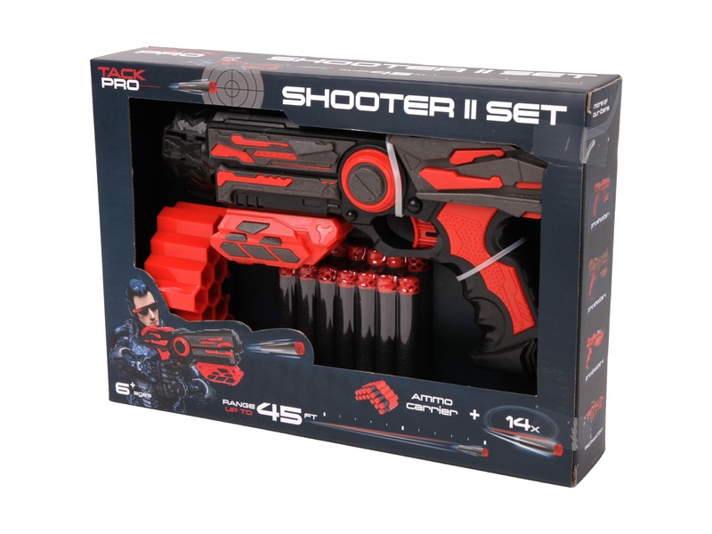Lőj a nagyobb pisztollyal, és használd a lőszertartó tárat is! A Tack Pro szivacslövő pisztoly egy műanyag, piros és fekete színű lőfegyver, amivel ártalmatlan szivacsos lőszereket tudsz kilőni. A pisztolyt minden lövés előtt fel kell húzni, a készlet egy tárat és 14 darab szivacsos lőszert is tartalmaz. A Tack Pro szivacslövő pisztoly akár 15 méteres távolságra is képes ellőni. A fegyver mérete: 23 cm.