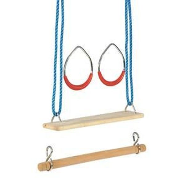 Teljen aktívan a nyári szünet és a kerti időtöltés ezzel a fa hinta és tornász szettel! A lengőlap hossza 40 x 10,5 cm-es, felfüggesztési hossza 190-340 cm. A szett tartalmaz még egy 48 cm-es tornagyűrűt, vízszintes tornarudat és egy állítható kötelet. Maximális teherbírás: 60 kg.