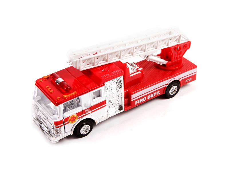 Olts tüzet, ments életeket a létrás tűzoltó autóval! A Tűzoltóautó fénnyel és hanggal fémből és műanyagból készült, forgatható, emelhető és toldható létrával. Az autó ajtajai nyithatók és hátrahúzós motorral van felszerelve, menet közben az autó szirénázik, miközben a villogói fényeket adnak ki magukból. A Tűzoltóautó fénnyel és hanggal LR44 gombelemmel működik, a csomagolás az elemeket tartalmazza. Méret: 19 cm.