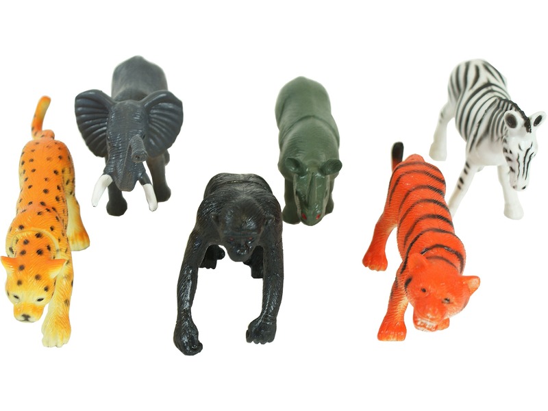 Rendezd be a saját szavannádat vadállatokkal! A Vadállat 6 darabos készlet egy leopárd, orrszarvú, zebra, tigris, oroszlán és elefánt műanyag állatfiguráját tartalmazza. Az állatok szép festéssel készültek, együtt használhatók bármilyen állatos játékokkal is. A Vadállat 6 darabos készlet állatainak mérete: 11-13 cm.