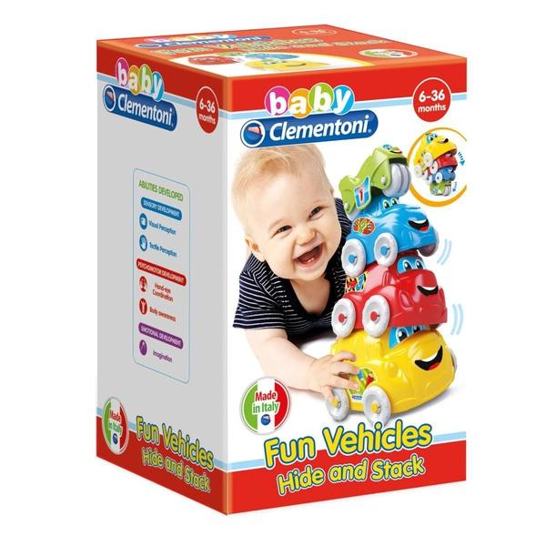 Egymásra építhető színes kisautók, mely fejleszti a kéz és a szem koordinációját. Elősegíti a látást és a kézi készségeket. A doboz 4 élénk színű járművet tartalmaz: busz, teherautó, autó és motorkerékpár.