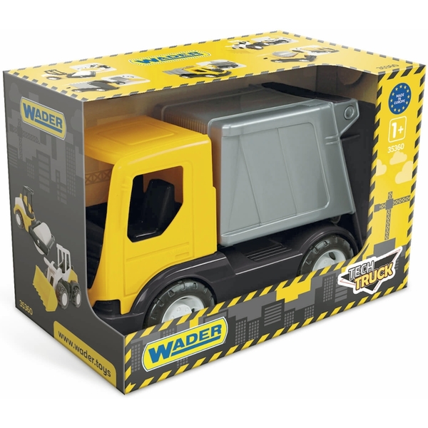 A Wader Tech Truck termékcsaládjába tartozó, 26 cm hosszú kukásautó rendkívül strapabíró és minőségi műanyagból készült, így bármilyen időjárási körülmény között használható kint és bent egyaránt. A szeméttartály levehető, a járművet pedig mozgatható emelővel készítették, hogy a kuka tartalmát bele is lehessen borítani.